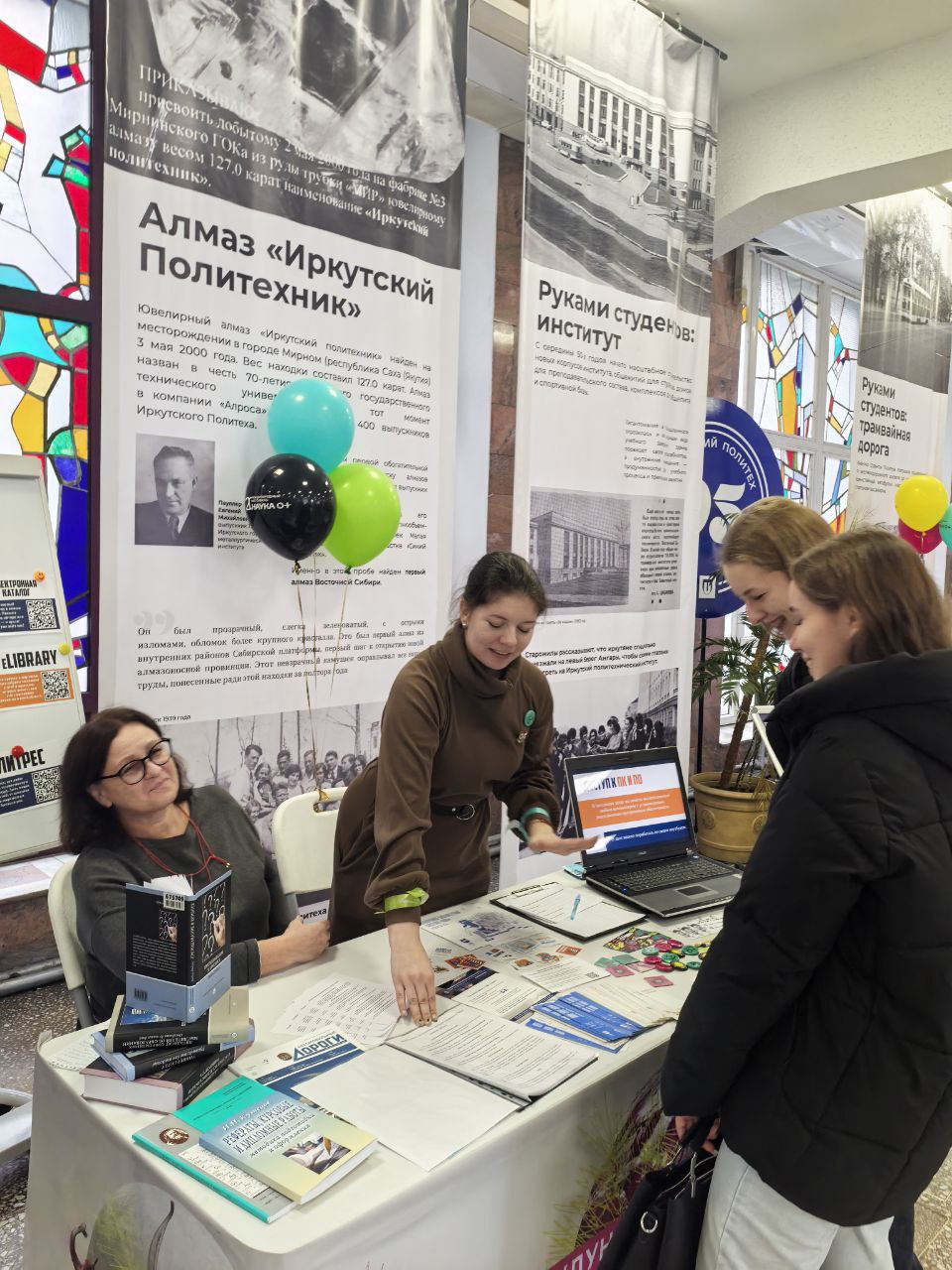На интерактивной площадке были представлены книжные новинки, в помощь работе аспирантам и преподавателям. Сотрудники библиотеки рассказали где искать информацию для курсовых работ, дипломов, научных статей.
