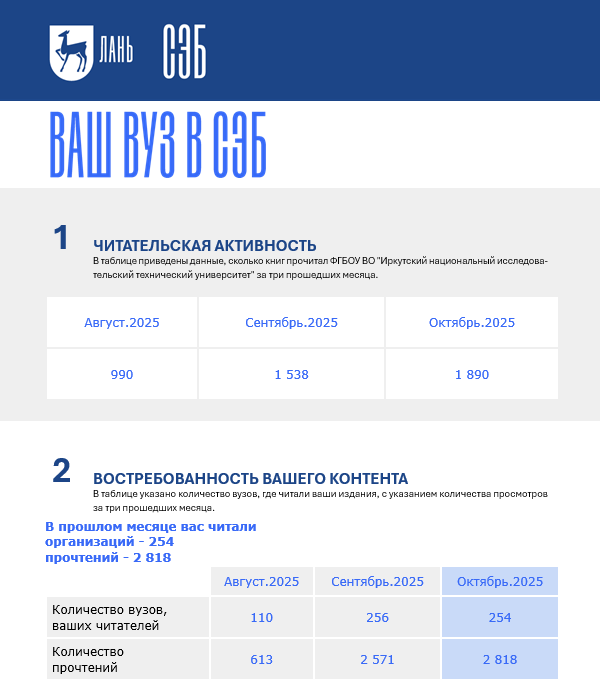 Представляем вашему вниманию ежемесячную статистику читательской активности ИРНИТУ на платформе СЭБ «Лань» за октябрь.