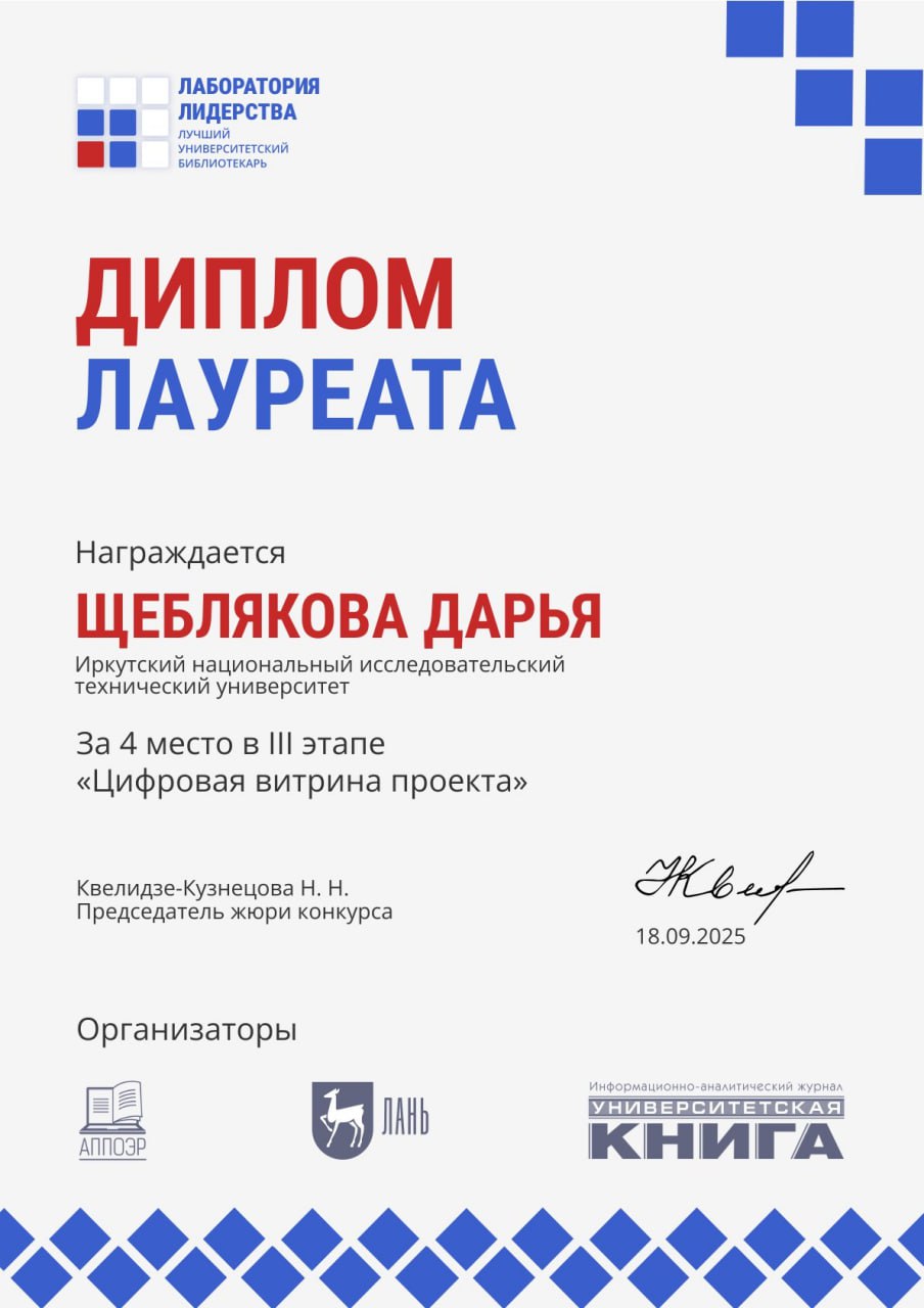Сотрудница НТБ ИРНИТУ, Щеблякова Дарья Дмитриевна, вошла в число 8 лауреатов по итогам III этапа Всероссийского конкурса «Лаборатория лидерства: Лучший университетский библиотекарь 2025″.