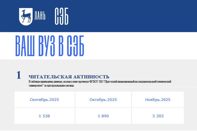 Представляем вашему вниманию ежемесячную статистику читательской активности ИРНИТУ на платформе СЭБ «Лань» за ноябрь.